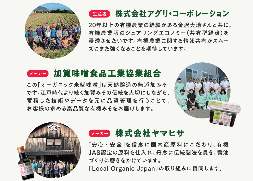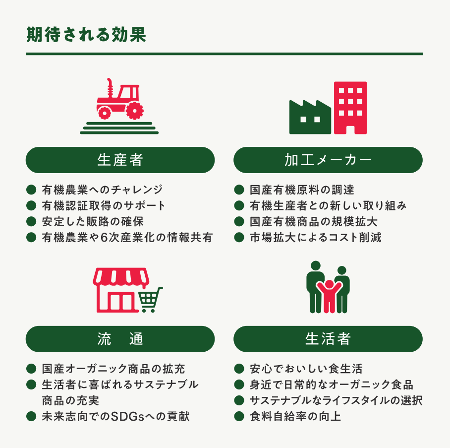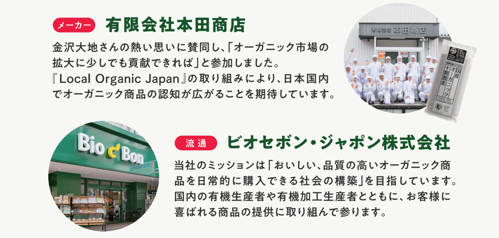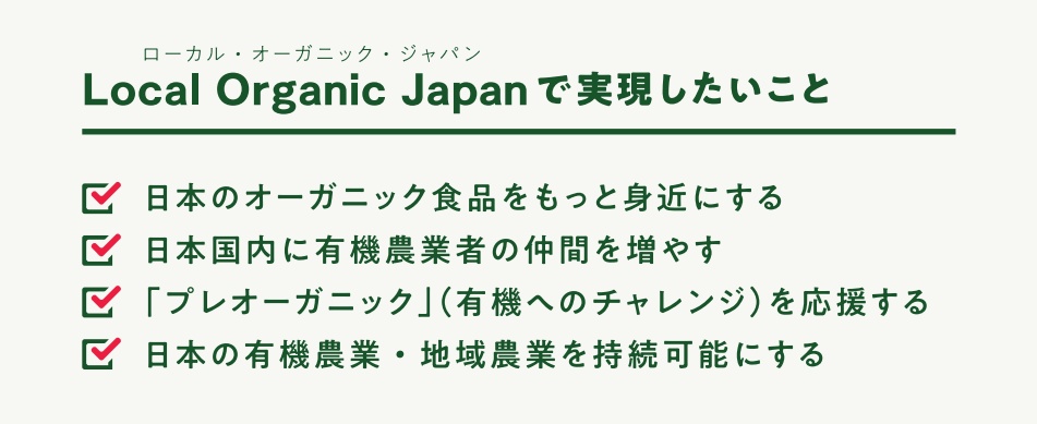 これまでの経験を活かし、これからはより広く、国内の生産者・加工メーカー・流通事業者のみなさまとともに、全国の有機農業者の応援にもつながる「ローカル&オーガニック」な商品を企画・製造・販売し、日本のオーガニック市場のさらなる成長をめざします。